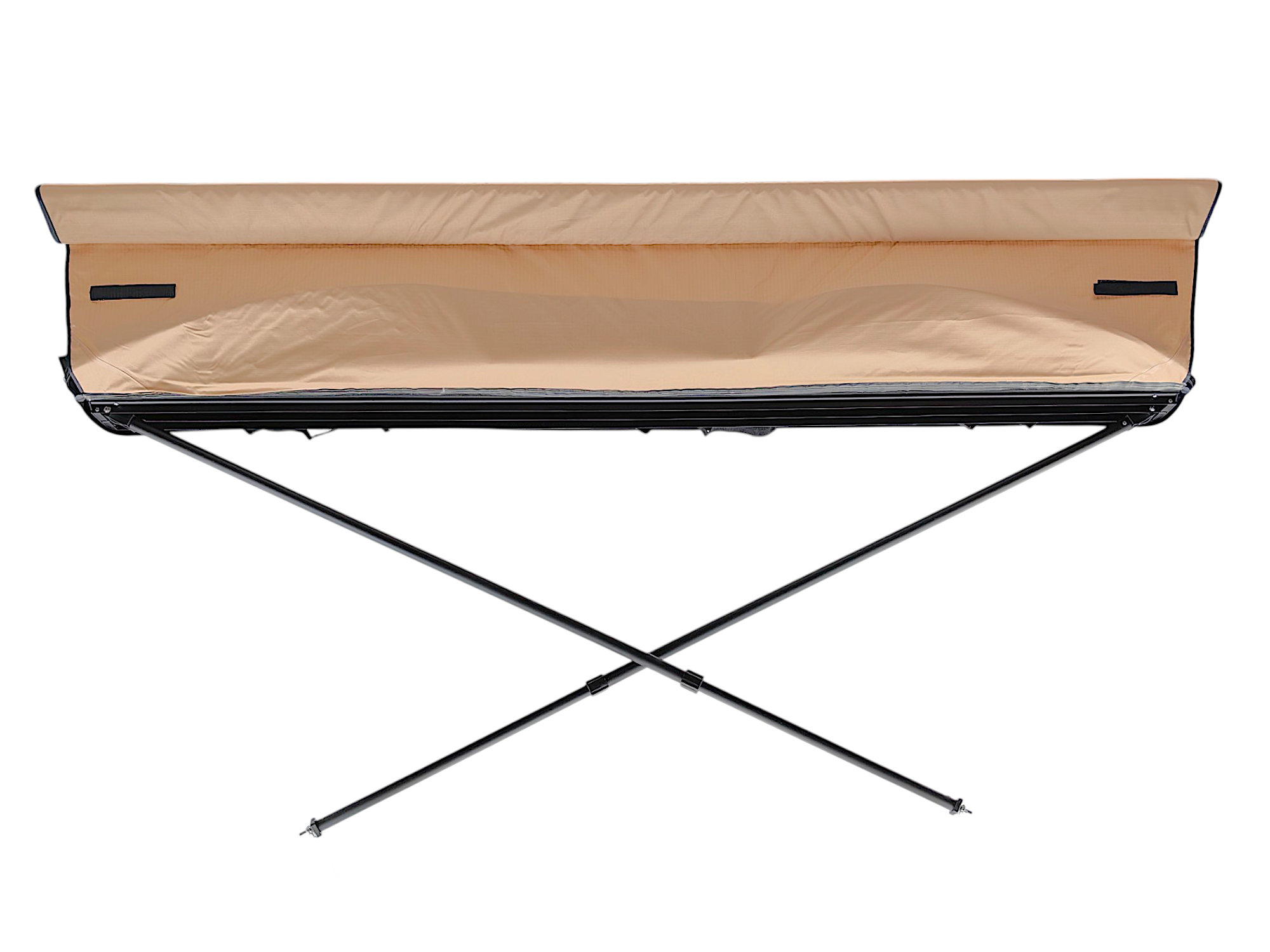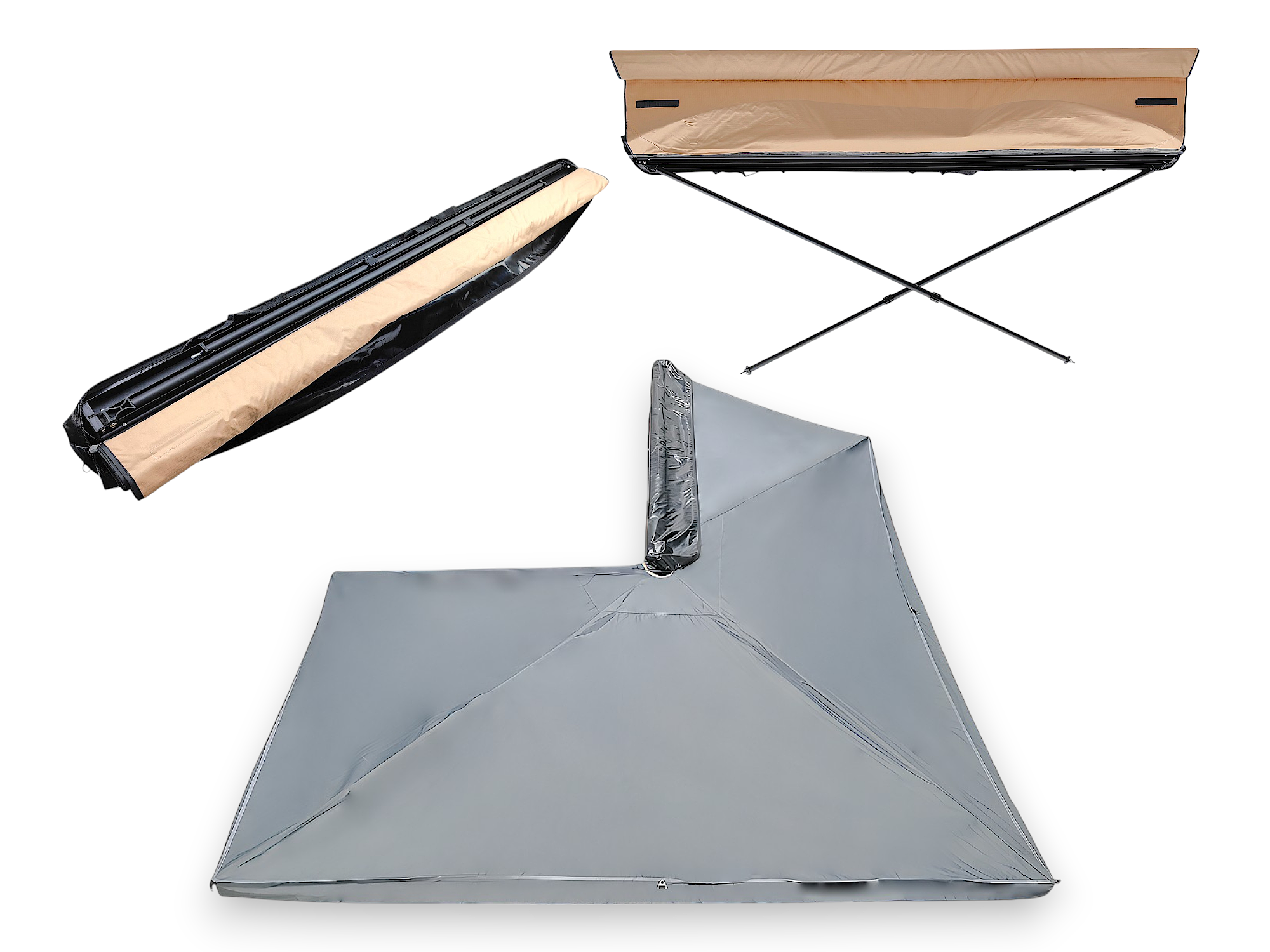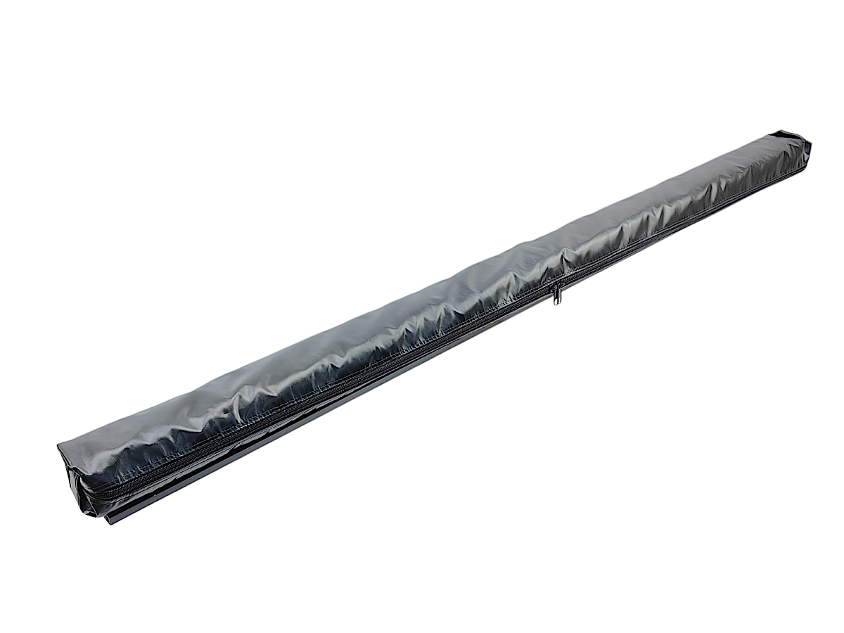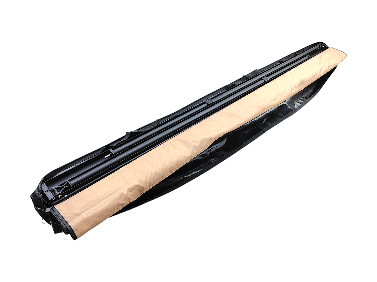 Маркиза монтируется на поперечные рейлинги любого автомобиля и не требует отдельного места в багажнике — весь комплект хранится в прочном влагозащитном чехле.