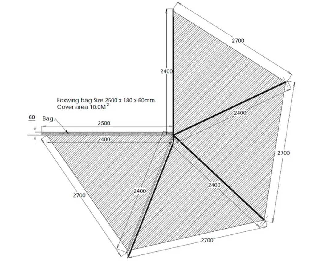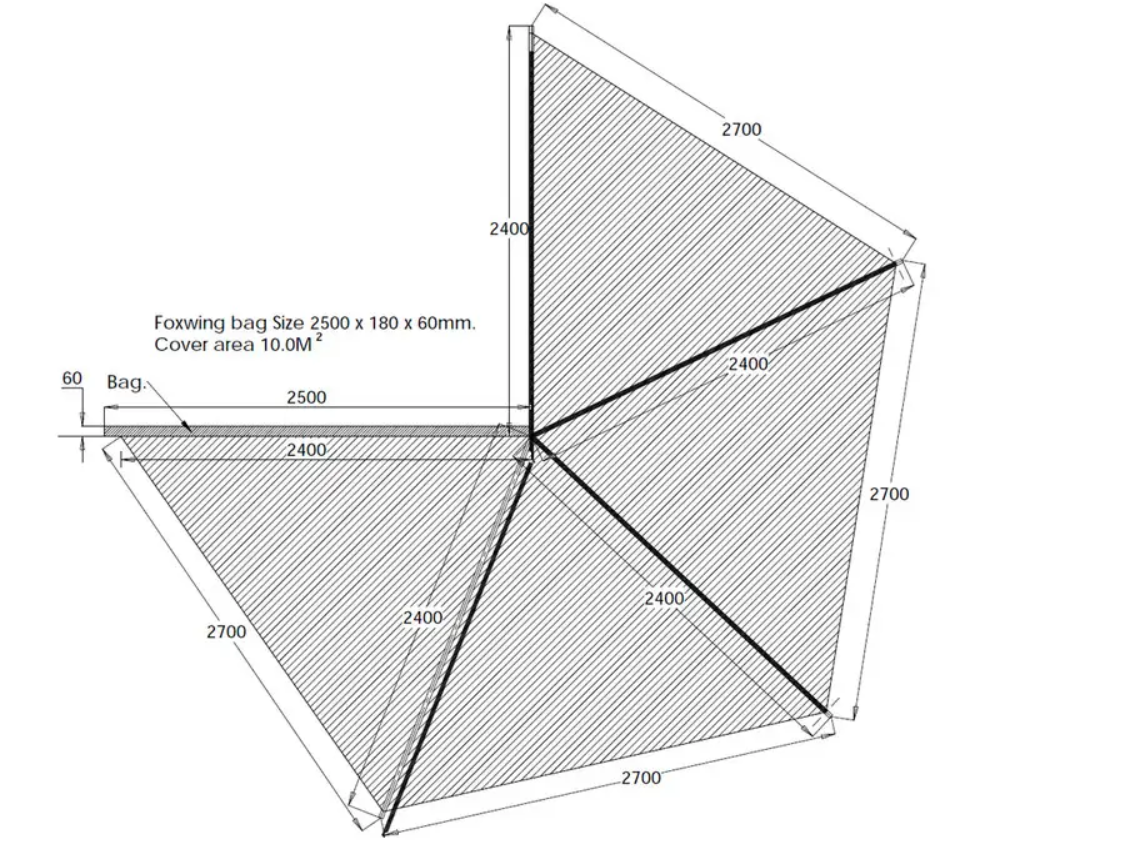 Конструкция раскрывается веером и образует навес площадью 10 м², укрывая не только стол и зону отдыха, но и багажник автомобиля. Это удобно при загрузке снаряжения и готовке под дождём.
